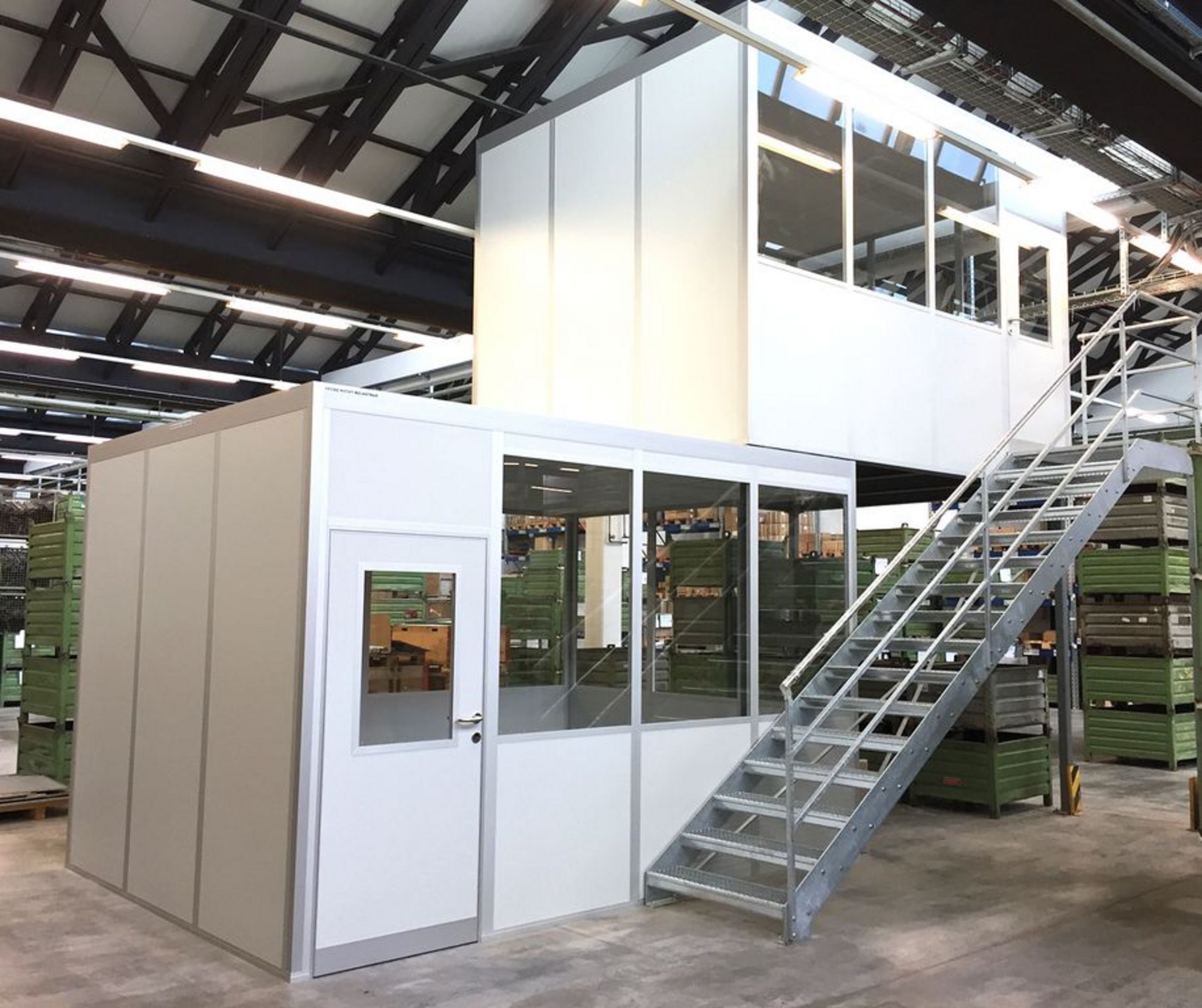 Zweigeschossige Hallenbüros werden in Hallen mit hoher Raumhöhe errichtet, um die vorhandene Höhe optimal zu nutzen und zusätzliche Büroflächen zu schaffen. Sie ermöglichen eine flexible Raumgestaltung und kommen besonders häufig in Logistikzentren, Produktionshallen sowie großen Lagerflächen zum Einsatz.